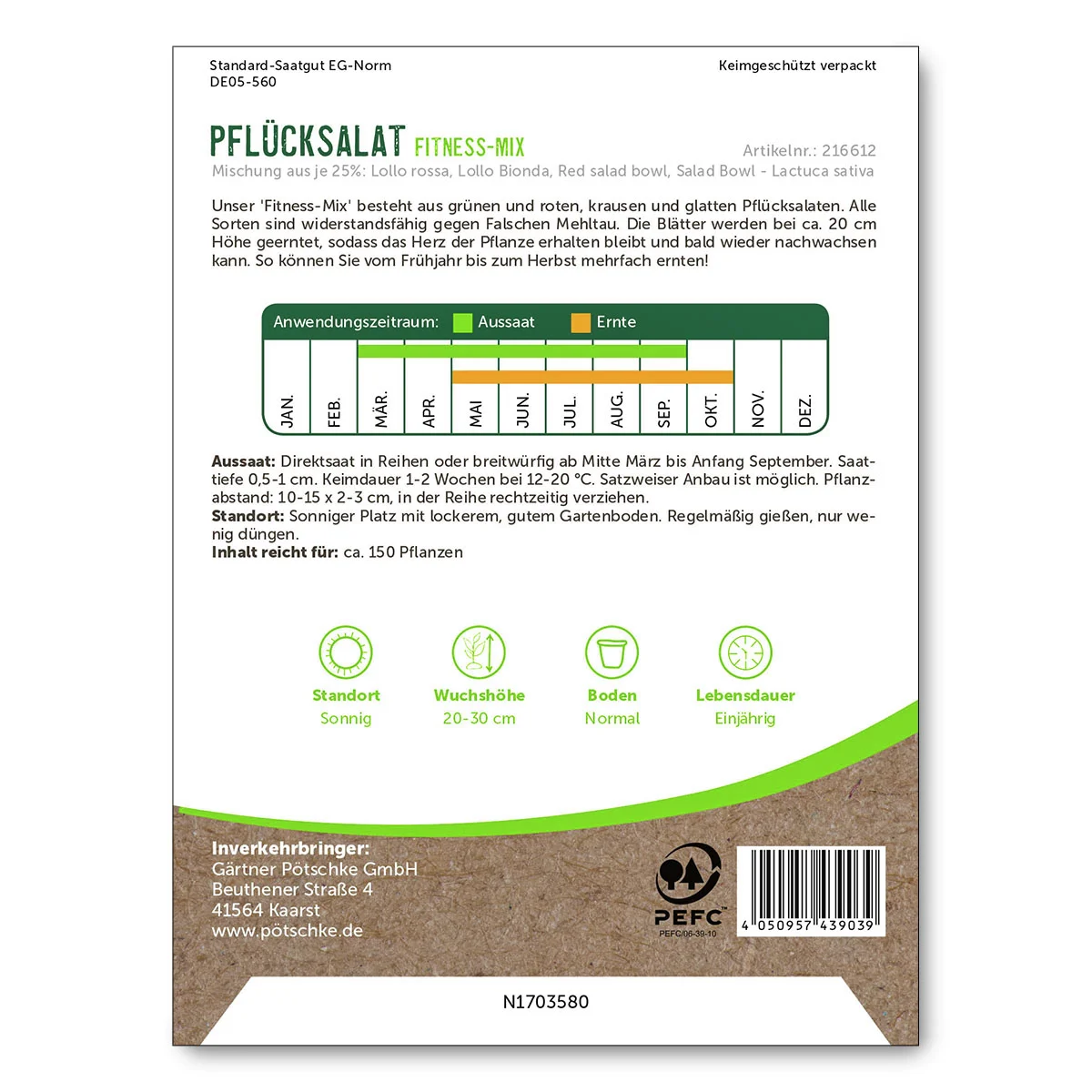 Unser Fitness-Mix besteht aus grünen und roten, krausen und glatten Schnittsalaten. Alle Sorten sind widerstandsfähig gegen Falschen Mehltau. Die Blätter werden bei ca. 20 cm Höhe mit einem Messer abgeschnitten, sodass das Herz der Pflanze erhalten bleibt und bald wieder nachwachsen kann. So können Sie vom Frühjahr bis zum Herbst mehrfach ernten!