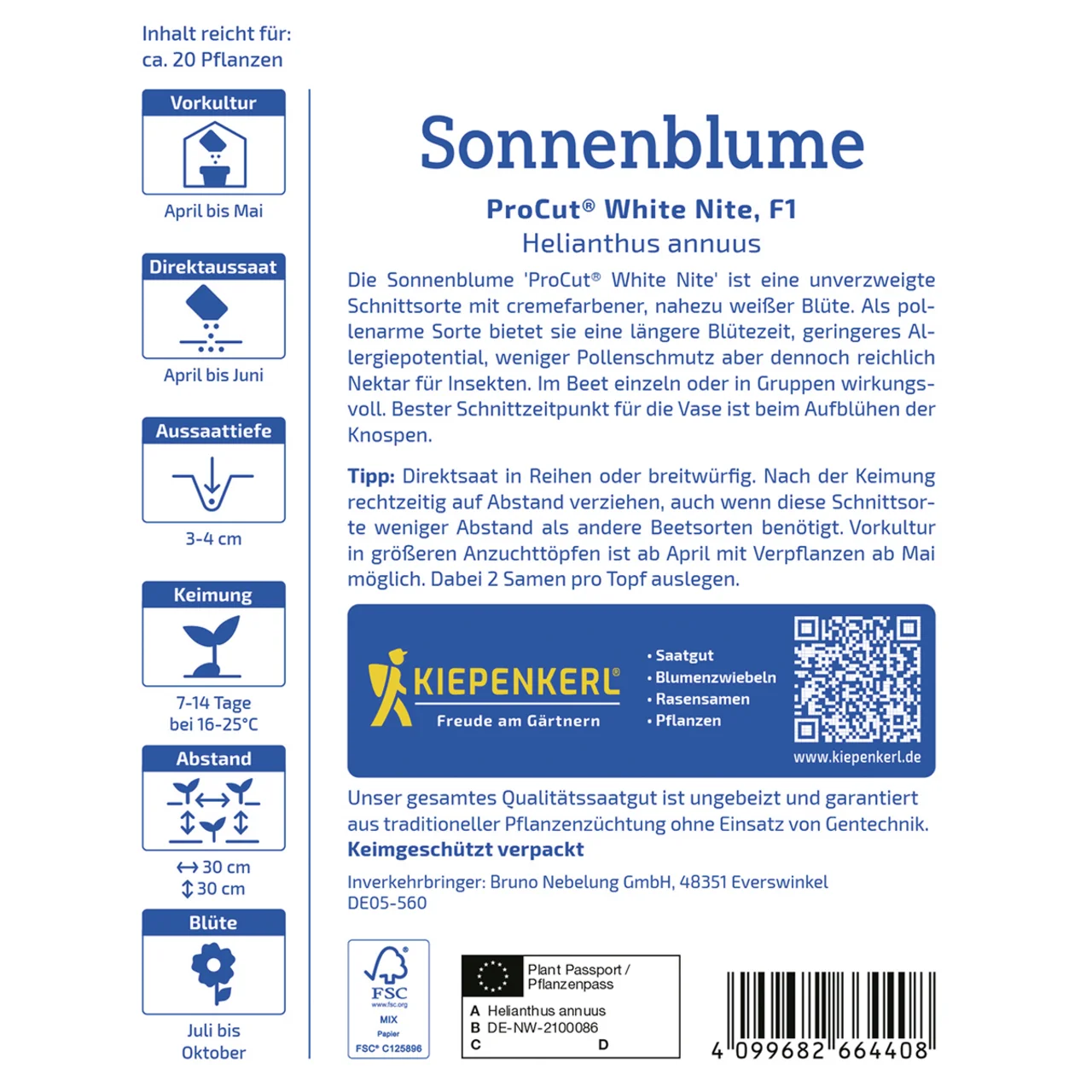 Tipp: Pollenfreie, hohe Sonnenblume mit stabilen Stängeln und strahlenden, großen, weiß-gelblichen Blüten. Dunkelkeimer, Saattiefe einhalten und bei Vorkultur bis zur Keimung abdecken und gleichmäßig feucht, jedoch nicht zu nass halten. Höhe 150-180 cm, einjährig. 1 Portion reicht für ca. 15 Pflanzen.