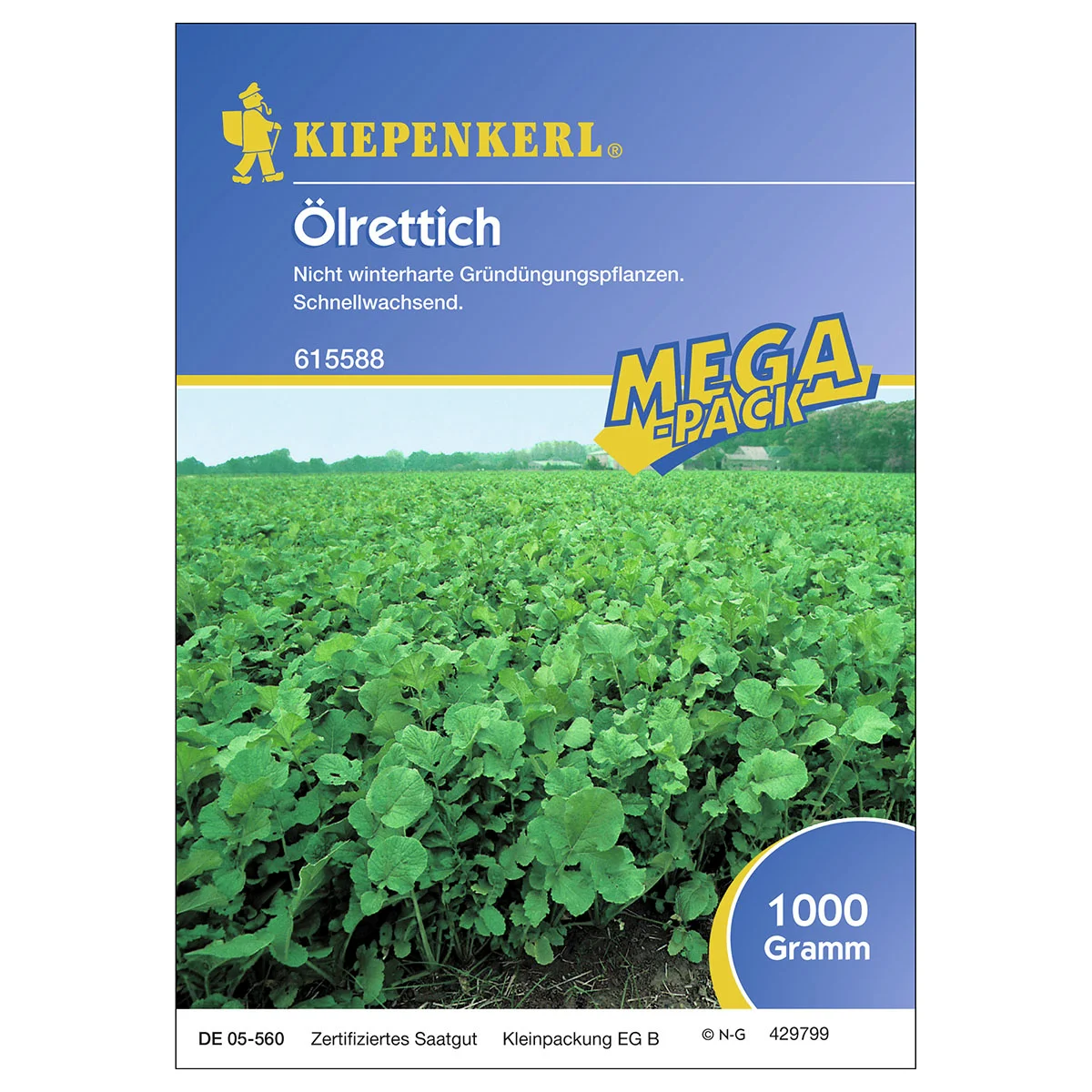 Der Ölrettich-Gründünger (Raphanus sativus) von Kiepenkerl wächst sehr schnell, bringt starken Blattwuchs zur besseren Bodenbeschattung und bildet tief gehende Pfahlwurzeln. Daher wird er auch Senkrechtdrainage für den Boden genannt und ist ideal zur Bodenverbesserung.