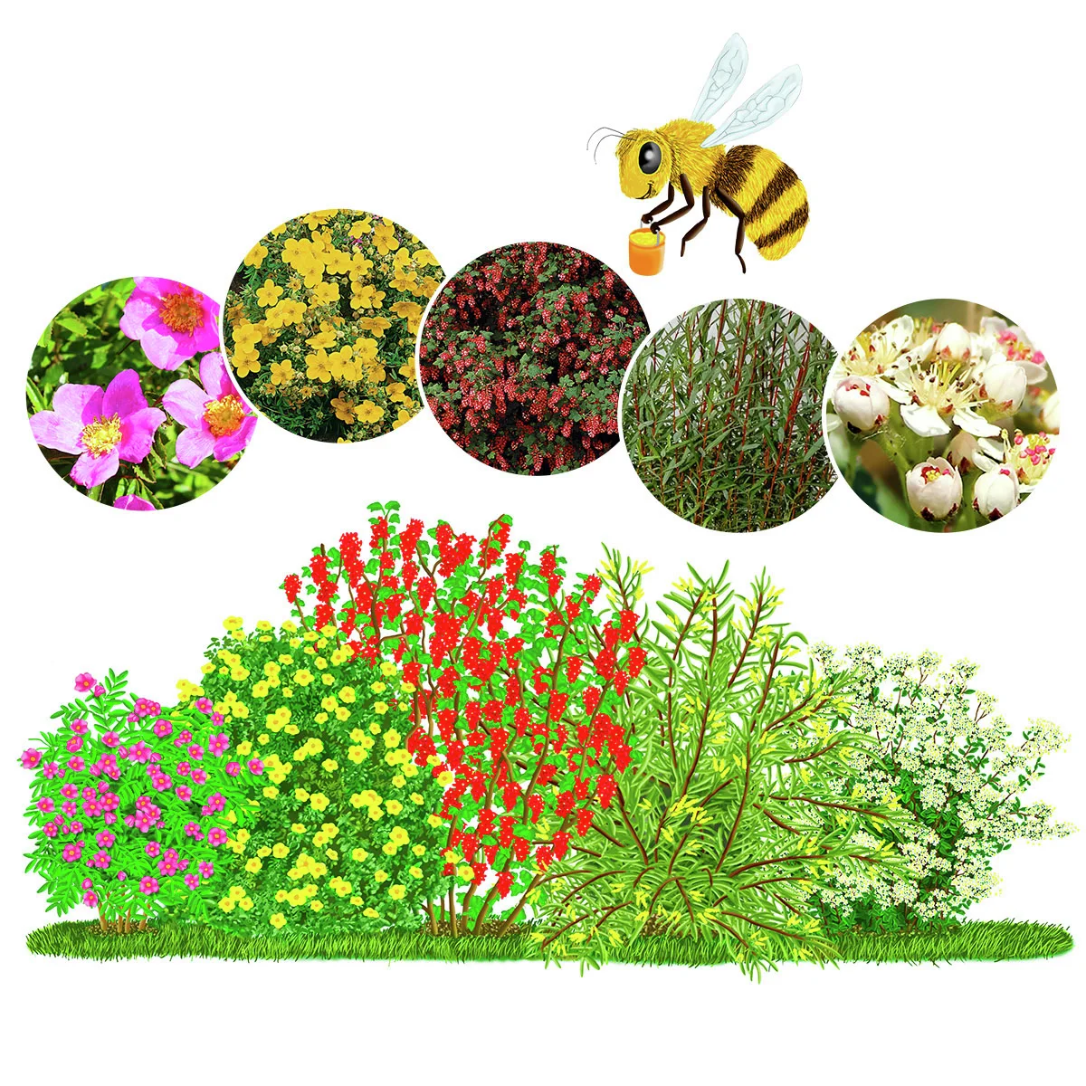 Dieses Sortiment, bestehend aus Glanzrose, Fünffingerstrauch, Zier-Johannisbeere, Rosmarinweide und Apfelbeere macht sich nicht nur prächtig in Ihrem Garten, sondern bietet den Bienen ein herrliches Buffet – als dauerblühende Hecke oder in Einzelstellung.