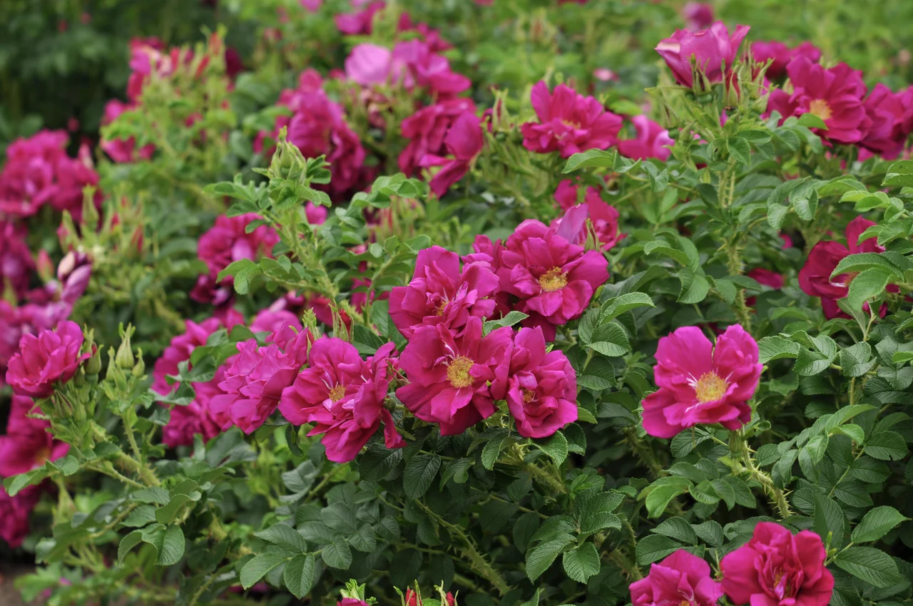 Die atemberaubende purpurne Farbe dieser Rose passt in den Garten eines Königs. Unglaublich blühend und herrlich duftend, ist diese Sorte vollständig gefüllt und trägt die ganze Saison über Blüten in lockeren Büscheln. Ihr wunderbarer Duft, eine Mischung aus orientalischen Gewürzen und Rosenwasser, ist bei Hummeln sehr beliebt. Es handelt sich um einen wohlgeformten Strauch, der sich perfekt für Hecken und trockene Böden eignet.
