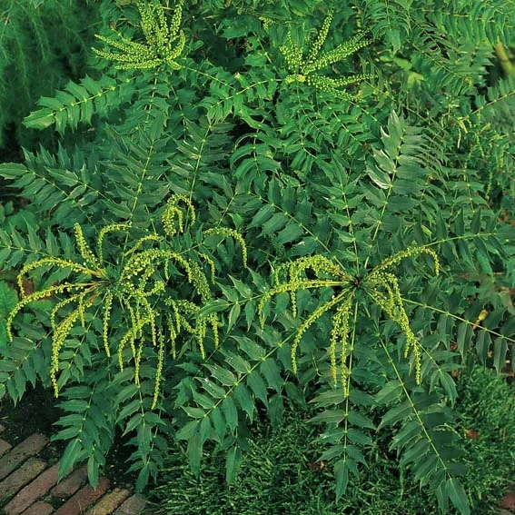 Eigenschaften: Diese immergrüne Mahonie wird 150-200 cm hoch und breit. Sie wächst relativ langsam. Eine Höhe von 2 m erreicht sie etwa in 7-10 Jahren. Die grünen, mit spitzen Blattdornen versehenen Blätter werden im Herbst gelb- bis orangerot. Die gelben Blüten erscheinen von Januar bis März, bei milder Witterung sogar schon im Dezember, und bringen Farbe in den winterlichen Garten. Die langen Blütentrauben verströmen einen angenehmen Honigduft. Der Strauch bildet tief gehende Hauptwurzeln. Die Blüten sind bei Bienen sehr beliebt, die Früchte bei Vögeln.