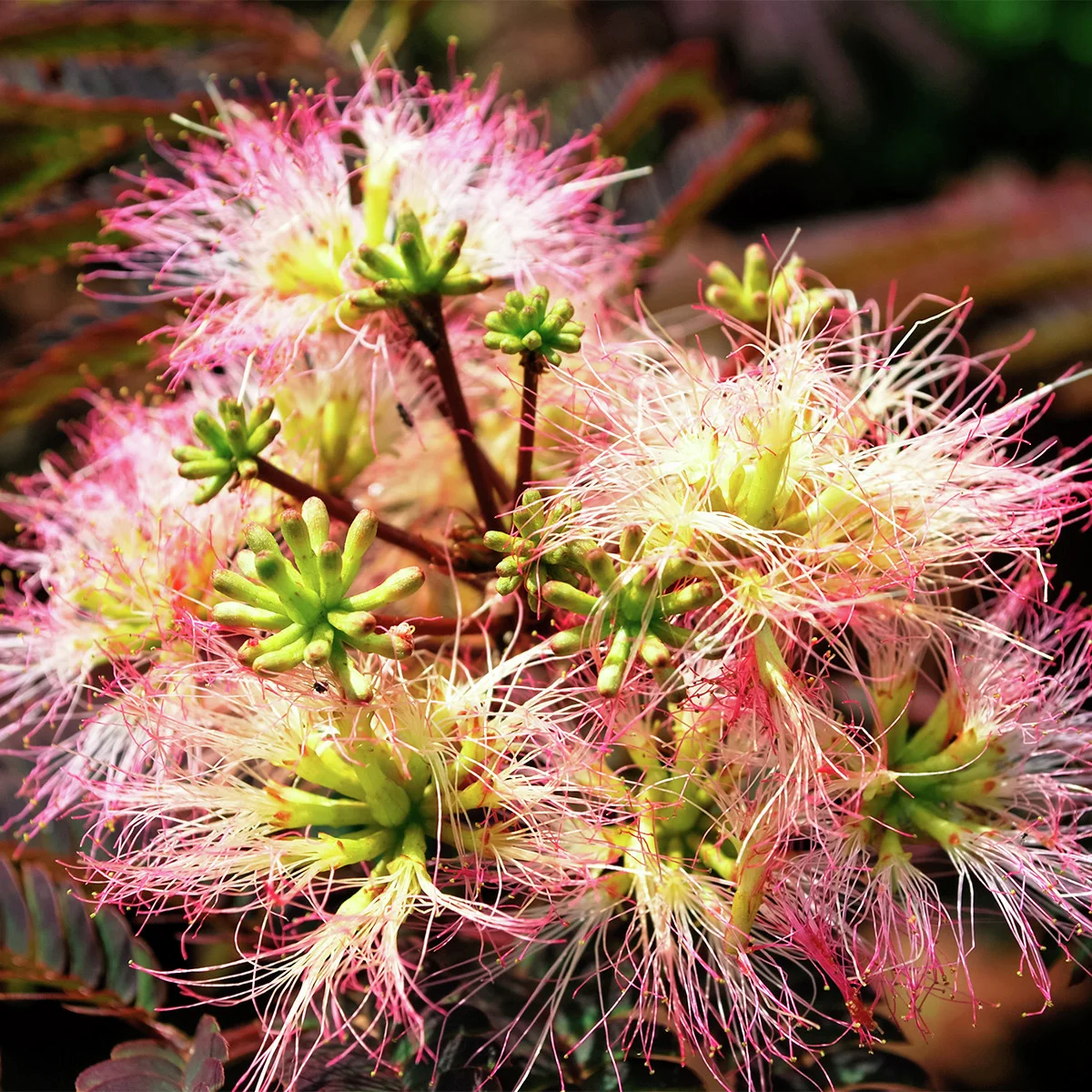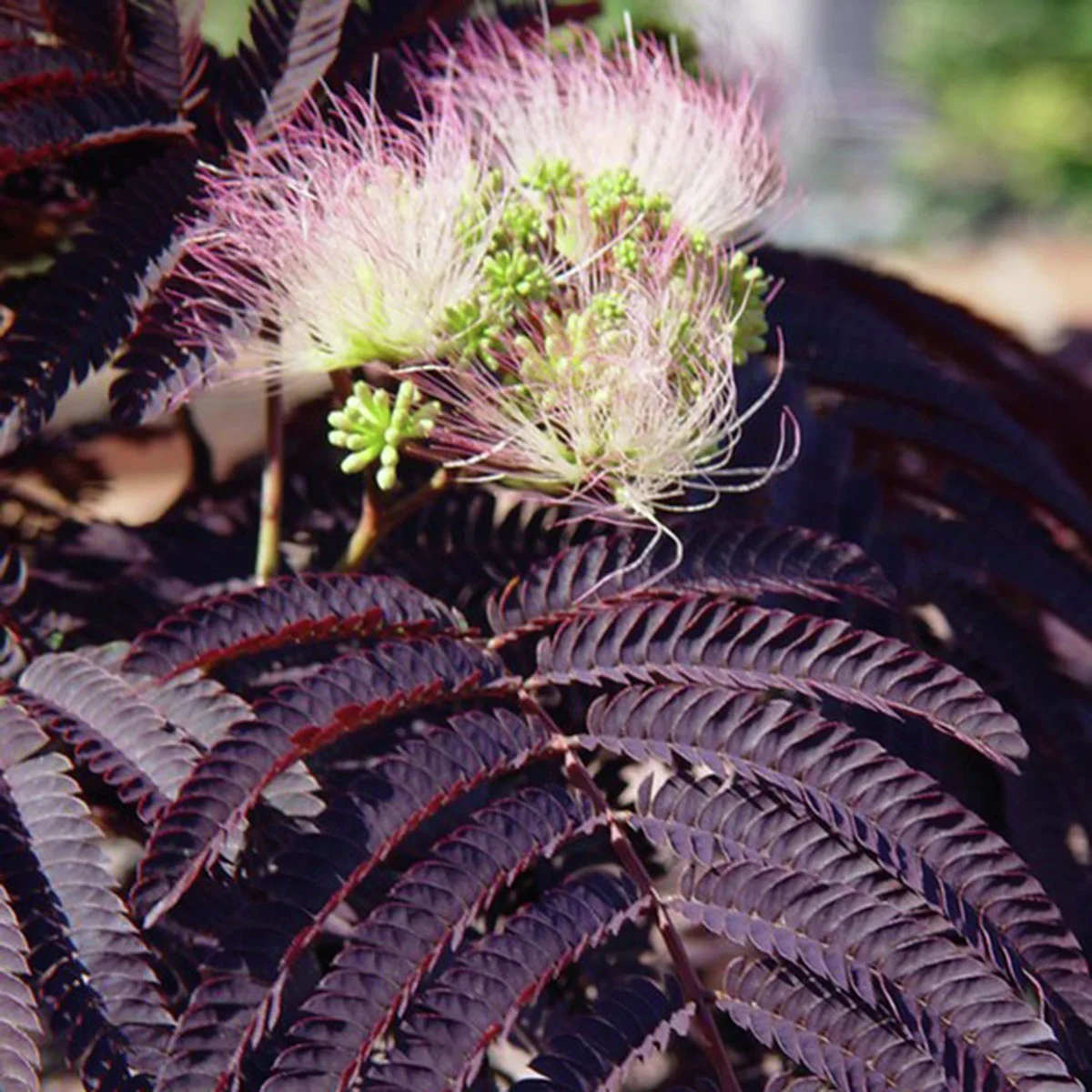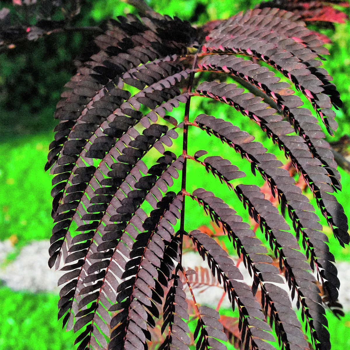 Summer Chocolate ist eine faszinierende Sorte des Seidenbaums, die aufgrund ihrer einzigartigen Merkmale und ihres attraktiven Aussehens immer beliebter wird. Diese Sorte zeichnet sich durch ihr dunkelrotes bis braunes Laub aus, das dem Baum einen exotischen und ansprechenden Look verleiht. Die wechselständigen Blätter sind zweifach gefiedert, zart und behalten ihre Farbe. Dies unterscheidet den Seidenbaum Summer Chocolate® von anderen Pflanzen mit kastanienbraunem Laub: Die Blätter erscheinen zunächst fast grün und werden erst bei Reife kastanienbraun, während es bei den meisten anderen Pflanzen genau umgekehrt ist. Albizia-Blätter schließen sich nachts und bei Regen.