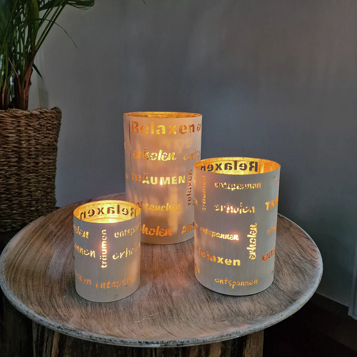 Das Licht flackern lassen, zurücklehnen und träumen ... Dieses dekorative Laternenset inspiriert Sie dazu, öfter mal innezuhalten und zu entspannen. Die drei unterschiedlich großen Laternen sind aus Metall gearbeitet, in das kleine Wohlfühl-Wörter gestanzt wurden. So sind wunderschöne Lichteffekte garantiert!
