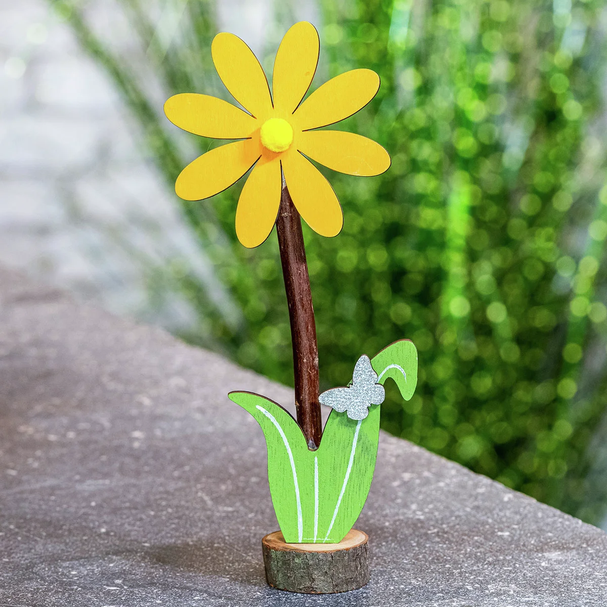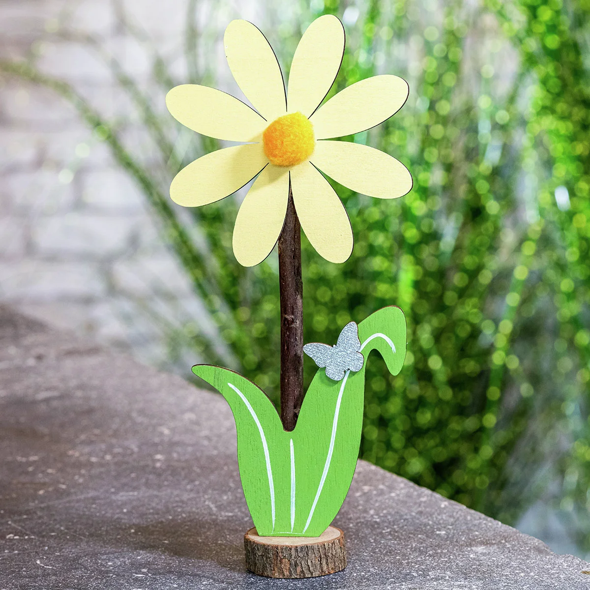 Blumen machen glücklich! So auch diese beiden farbenfrohen „Gewächse“, die liebevoll aus Holz gestaltet sind. Eine Baumscheibe gibt den Blümchen in frühlingshaftem Gelb und Orange festen Stand, sodass Sie sie dekorativ auf Tisch, Fensterbank oder an einem anderen Lieblingsplatz aufstellen können. Und sie verwelken nicht, versprochen!