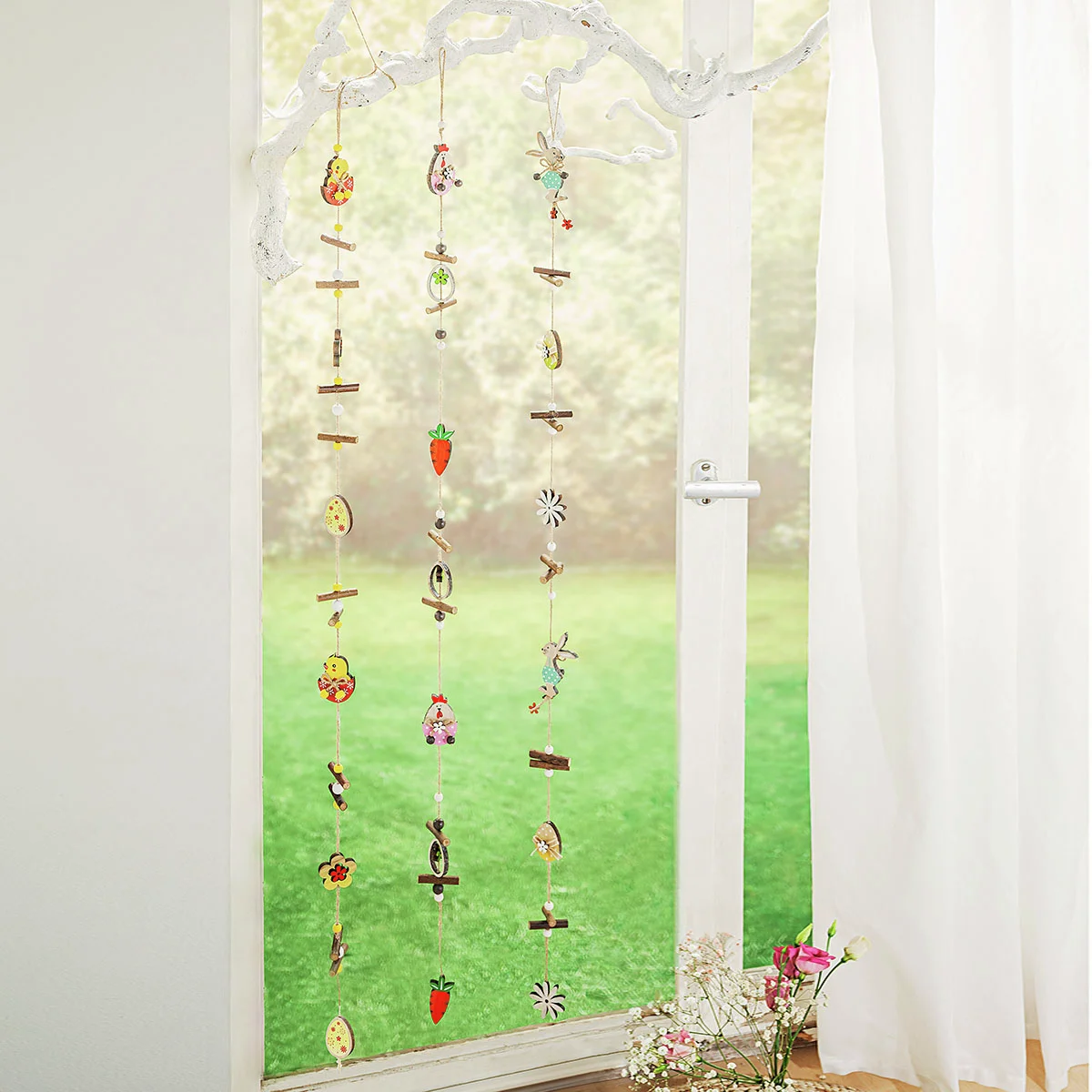 Hängen Sie die Dekogirlanden „Bunte Ostern“ an einem hübschen Platz auf, z.B. an der Vorhangstange, an der Wand, an einem Möbelknauf oder Garderobenhaken …