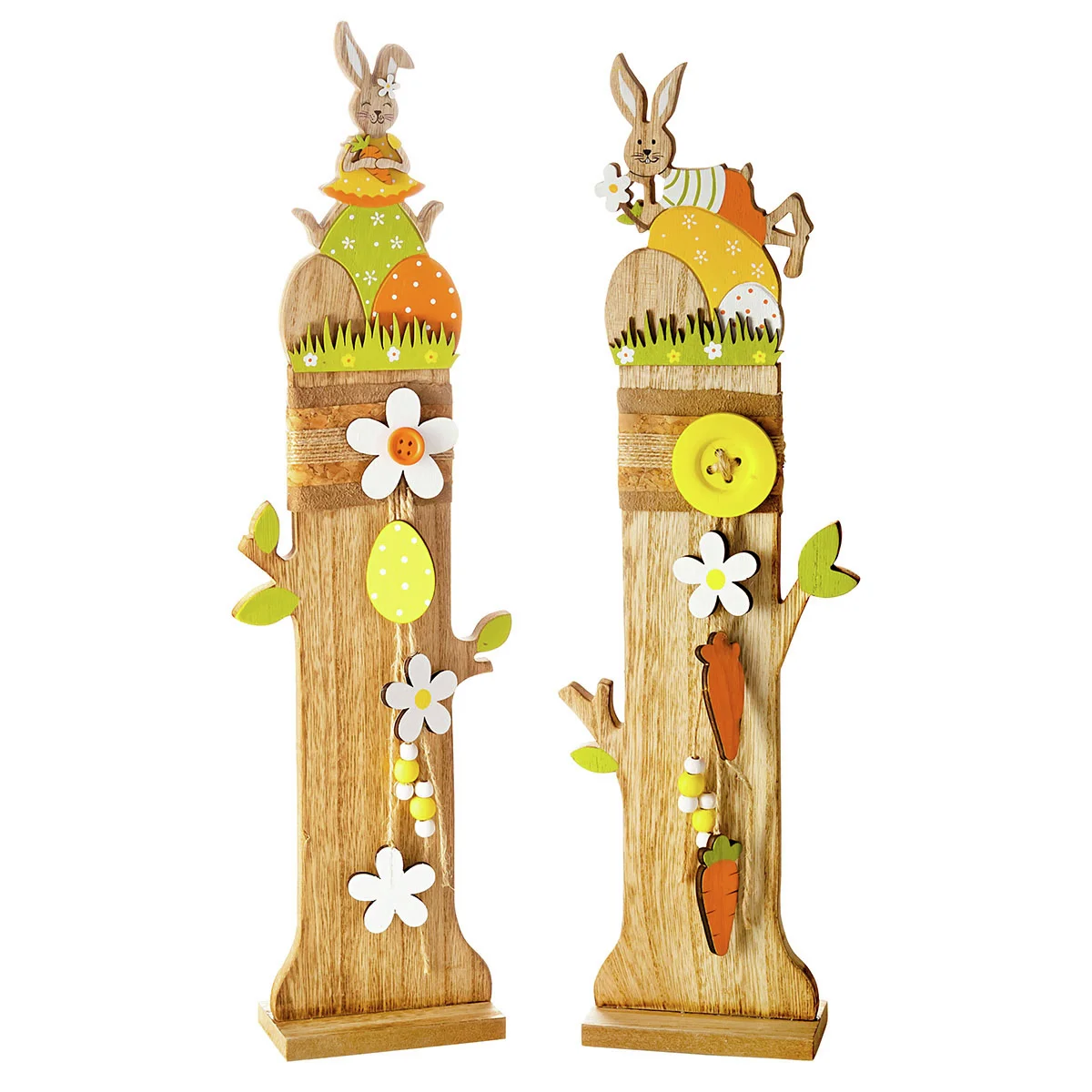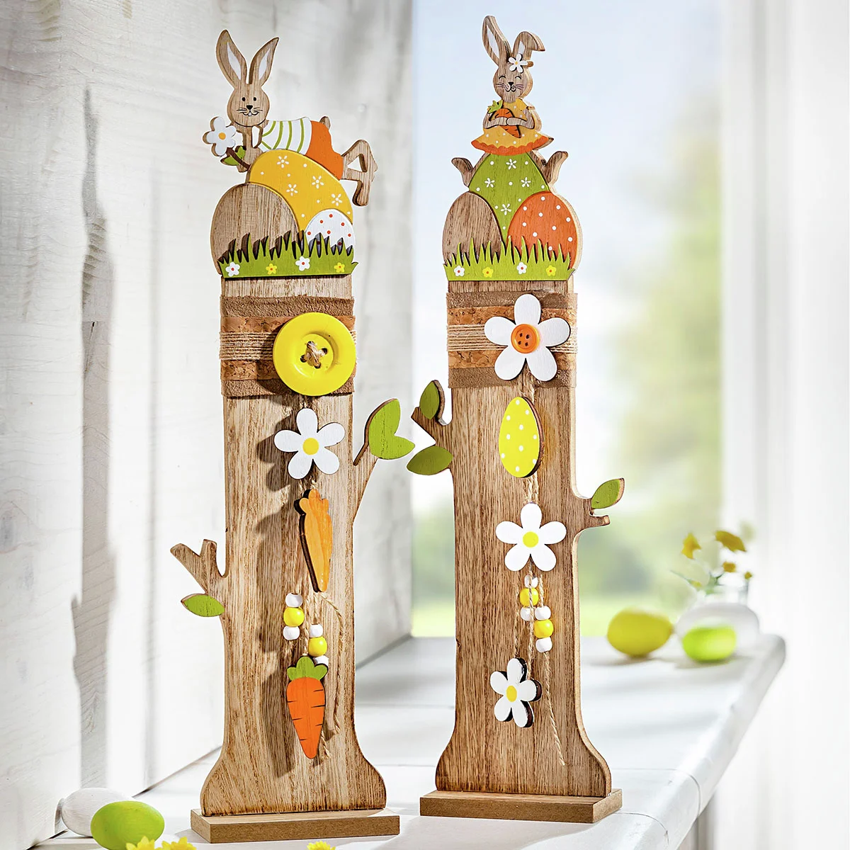 Beide Aufsteller sind aus Holz gefertigt, die Hasen-Aufsätze sind in frühlingsfrischen Farben sorgfältig handbemalt. Hübsche Details: Die Dekosockel sind mit Schmuckbändern aus Kork und Sisal verziert, auf der Vorderseite baumelt fröhlich eine fantasievolle Hängedeko – mit kolorierten Holzknöpfen und Blümchen, Ostereiern und Möhrchen.