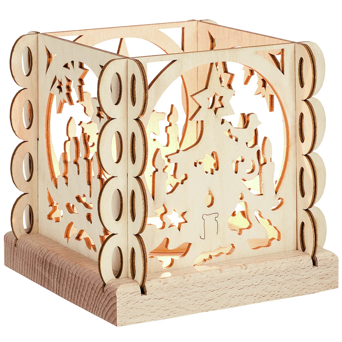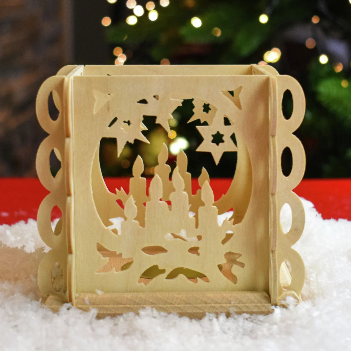 Für ein Teelicht (Teelicht nicht inklusive.). Holzkunst aus dem Erzgebirge: Sockel aus massivem Buchenholz, Motivblende aus filigranem Birkensperrholz, natur. Made in Germany.