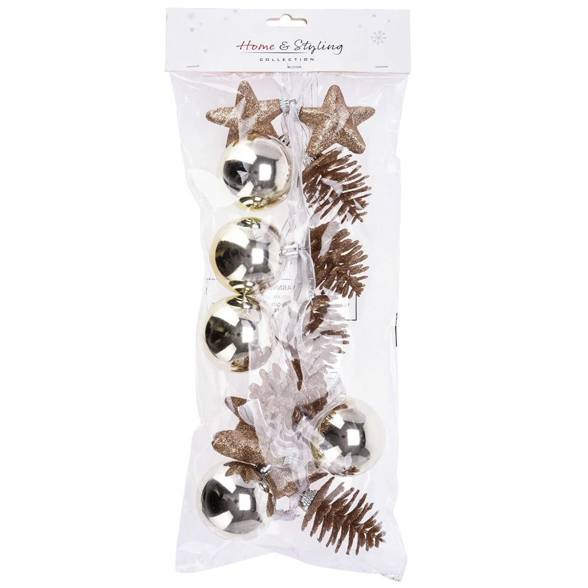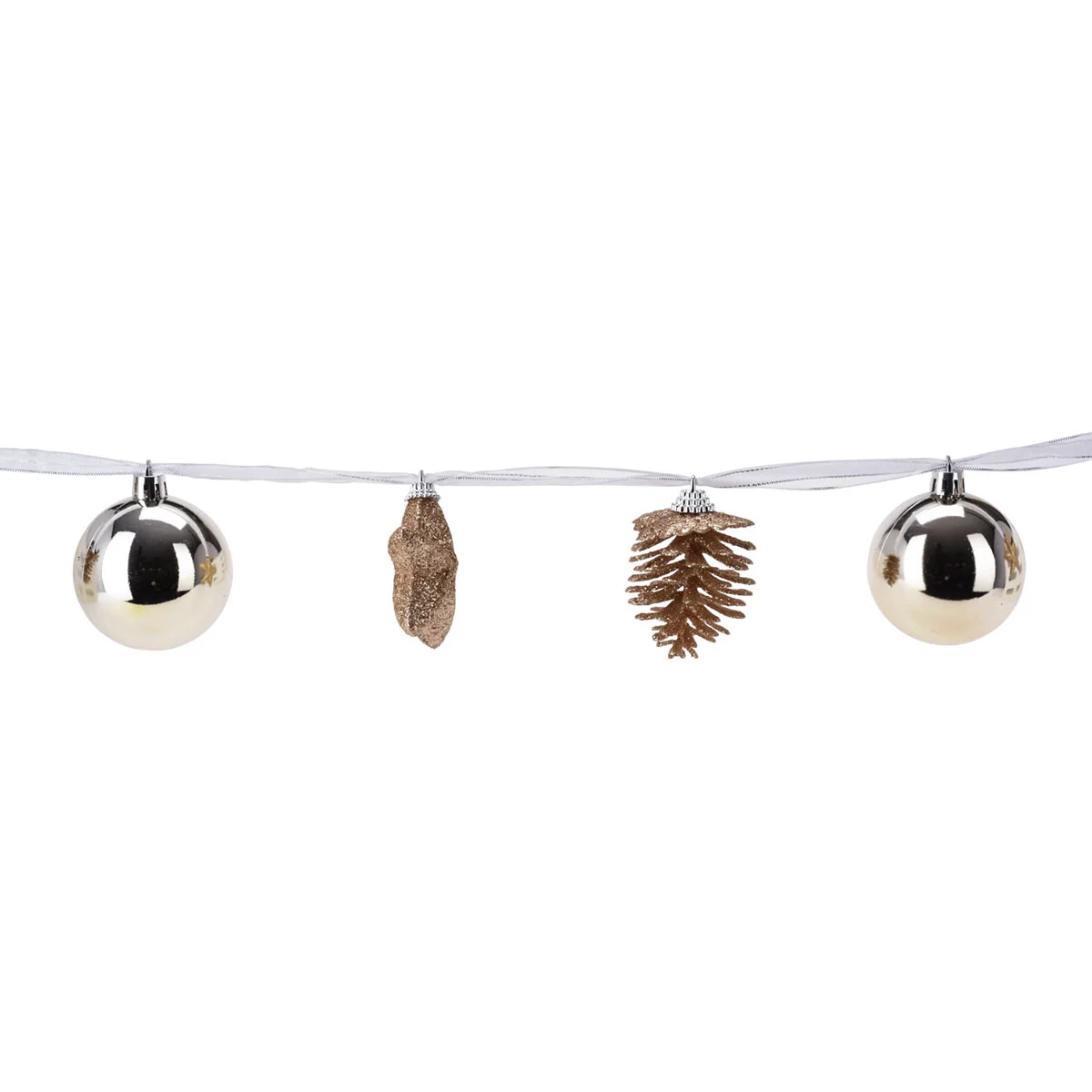 Die geschmackvolle Weihnachtsgirlande ist mit je 5 x 6 cm großen Anhängern in Form von goldenen Sternen, Zapfen und Kugeln bestückt und wirkt wunderschön z.B. im Tannenbaum, am Fenster oder auf dem Sideboard. Aus Glas und Kunststoff.