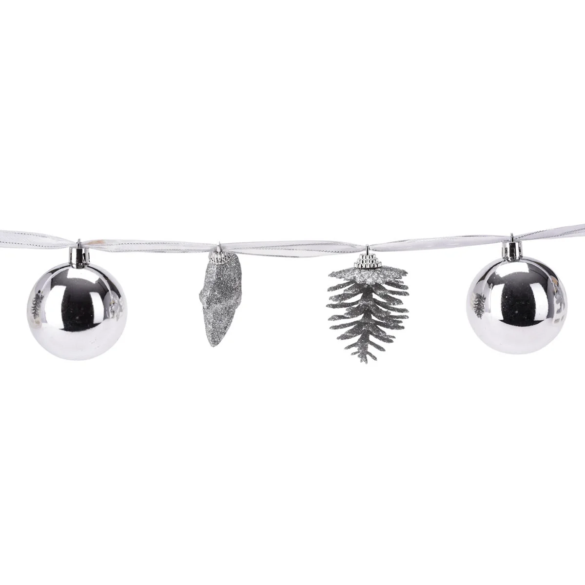 Die geschmackvolle Weihnachtsgirlande ist mit je 5 x 6 cm großen Anhängern in Form von silbernen Sternen, Zapfen und Kugeln bestückt und wirkt wunderschön z.B. im Tannenbaum, am Fenster oder auf dem Sideboard. Aus Glas und Kunststoff