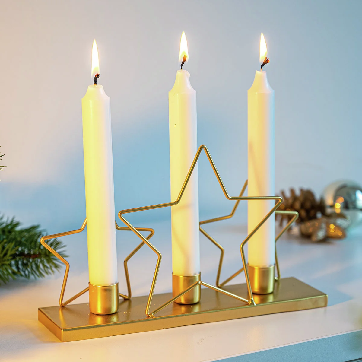 Mit dem markanten rechteckigen Sockel und den goldenen Stern-Silhouetten ist dieser Stabkerzenhalter für drei Kerzen eine tolle Alternative zum klassischen Leuchter.