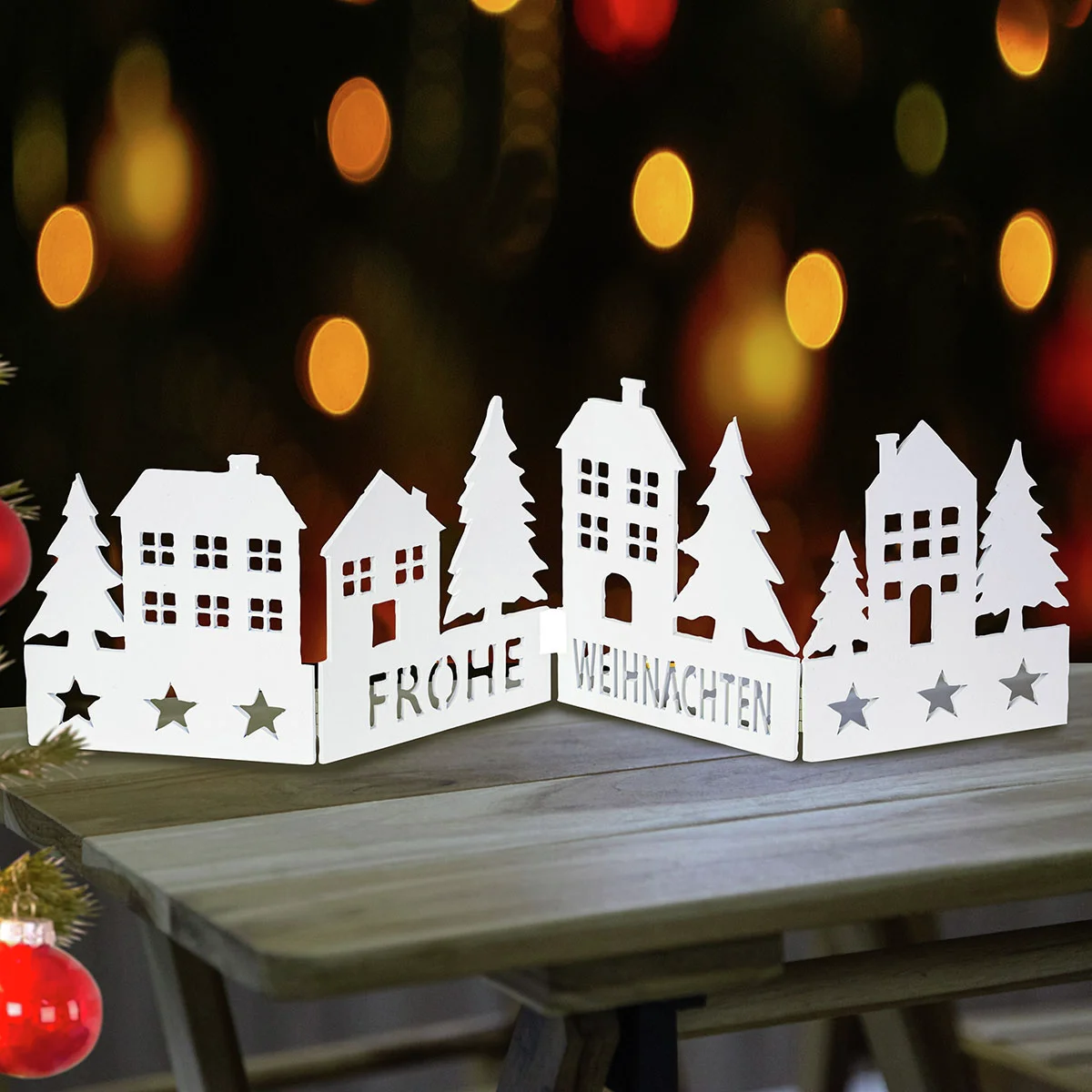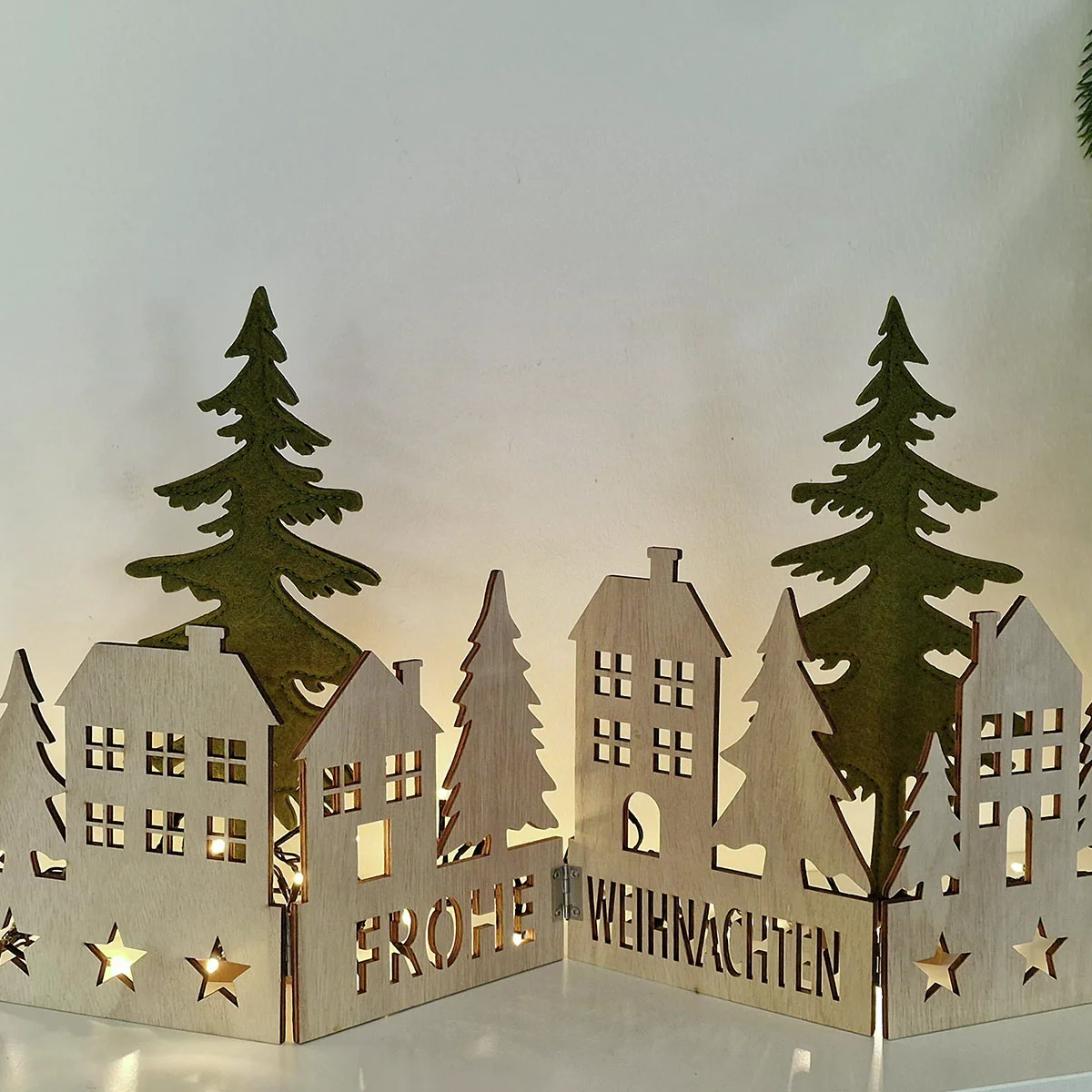 Hübsche Häuschen und charmante Tannenbäume reihen sich hier gesäumt von einer mit Sternchen und Schrift verzierten Bordüre aneinander. Die kleinen Scharniere erlauben ein gefaltetes Aufstellen, was der Dekoration eine verspielte Optik verleiht. Prima zu kombinieren mit Kerzen, bunten Kugeln und Co. Aus Holz in Weiß.