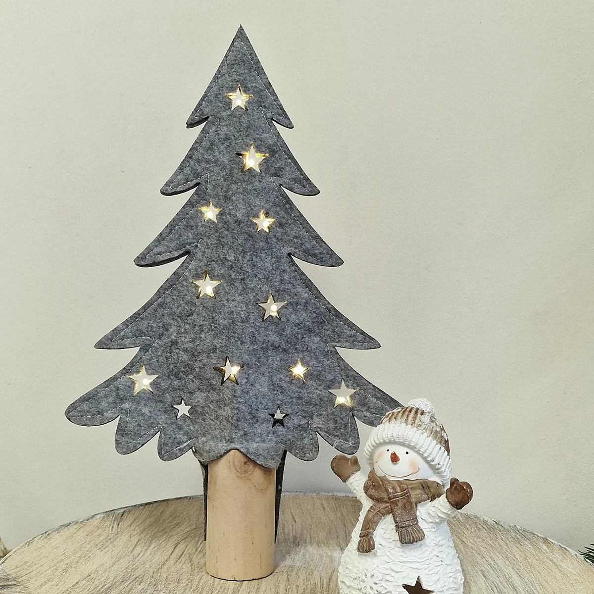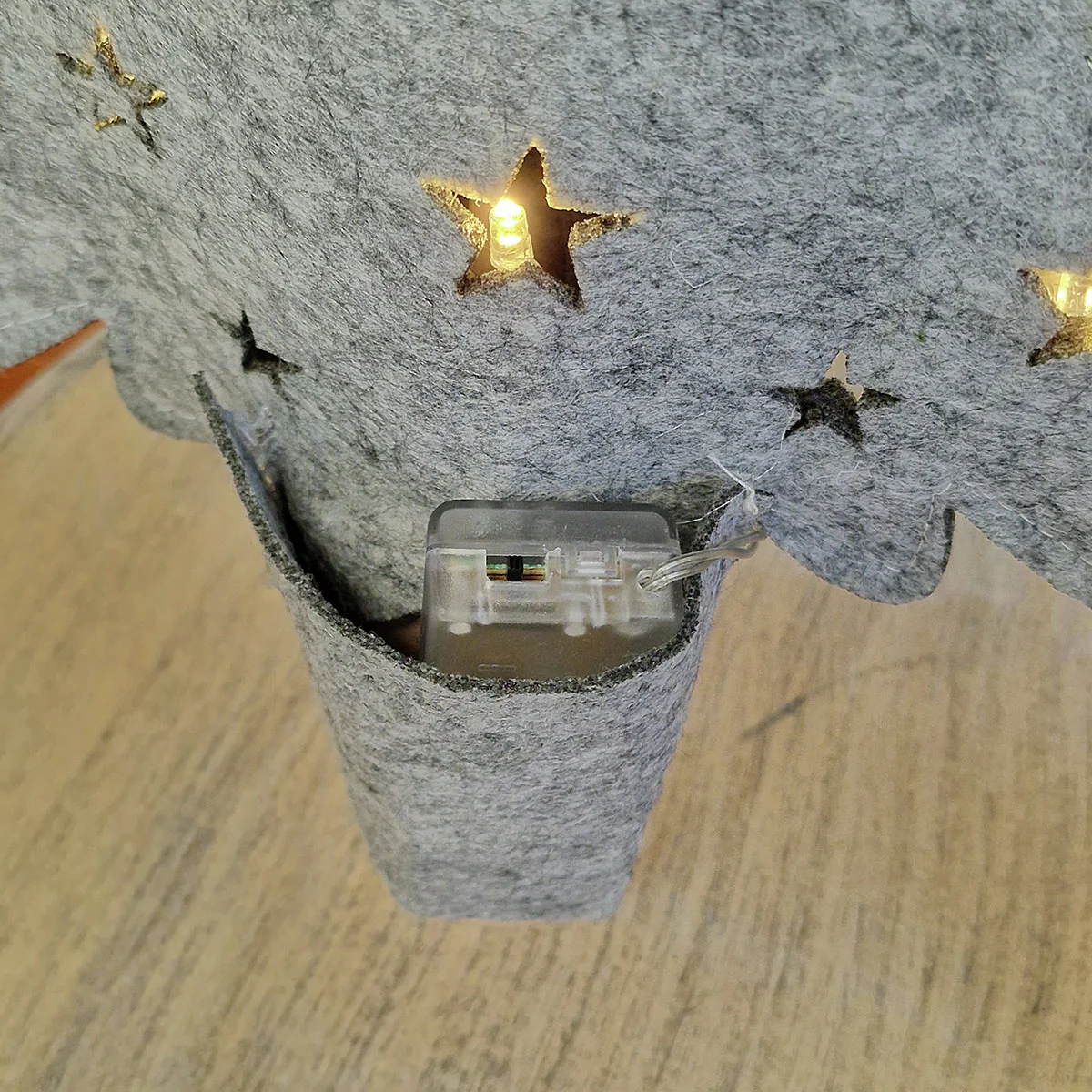 Dieser Tannenbaum aus grauem Filz schmückt sich mit funkelnden Sternchen und die stehen ihm ausgesprochen gut – genau wie sein hölzernes Stämmchen! Da die warmweißen LEDs batteriebetrieben werden, können Sie ihn ganz unabhängig von einer Steckdose aufstellen. Ein Timer schaltet die Beleuchtung für Sie automatisch. Rundum gelungen, oder? Batterien (2xAA) nicht inklusive. Aus grauem Filz und Holz.