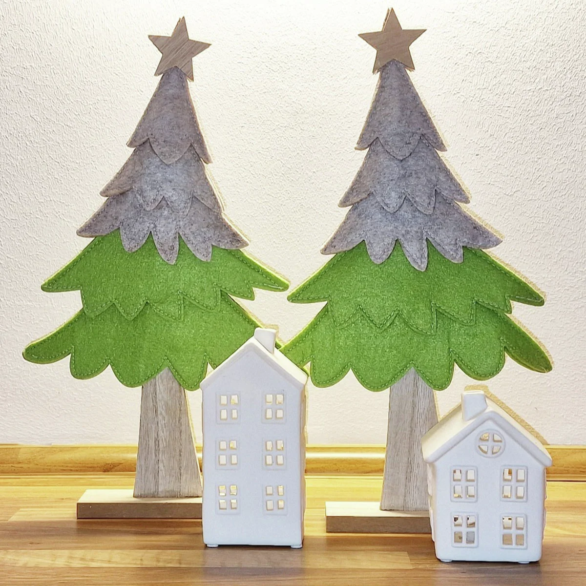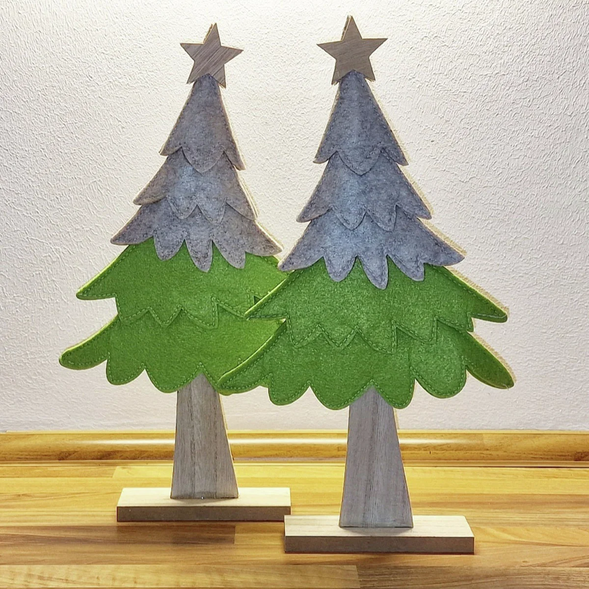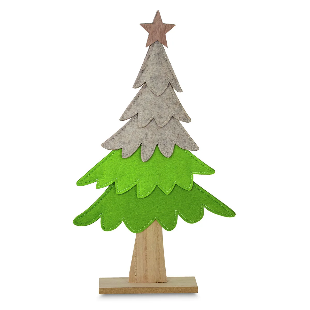 Mit solch einem dekorativen Tannenbaum aus Filz und Holz zieht natürlich-weihnachtliches Flair bei Ihnen ein! Die grau-grüne Farbkombination, der Standfuß aus naturfarbenem Holz und der kleine Holzstern an der Baumspitze sind wunderbar anzusehen. Ein echtes Schmuckstück! Aus mehrfarbigem Filz und Holz.