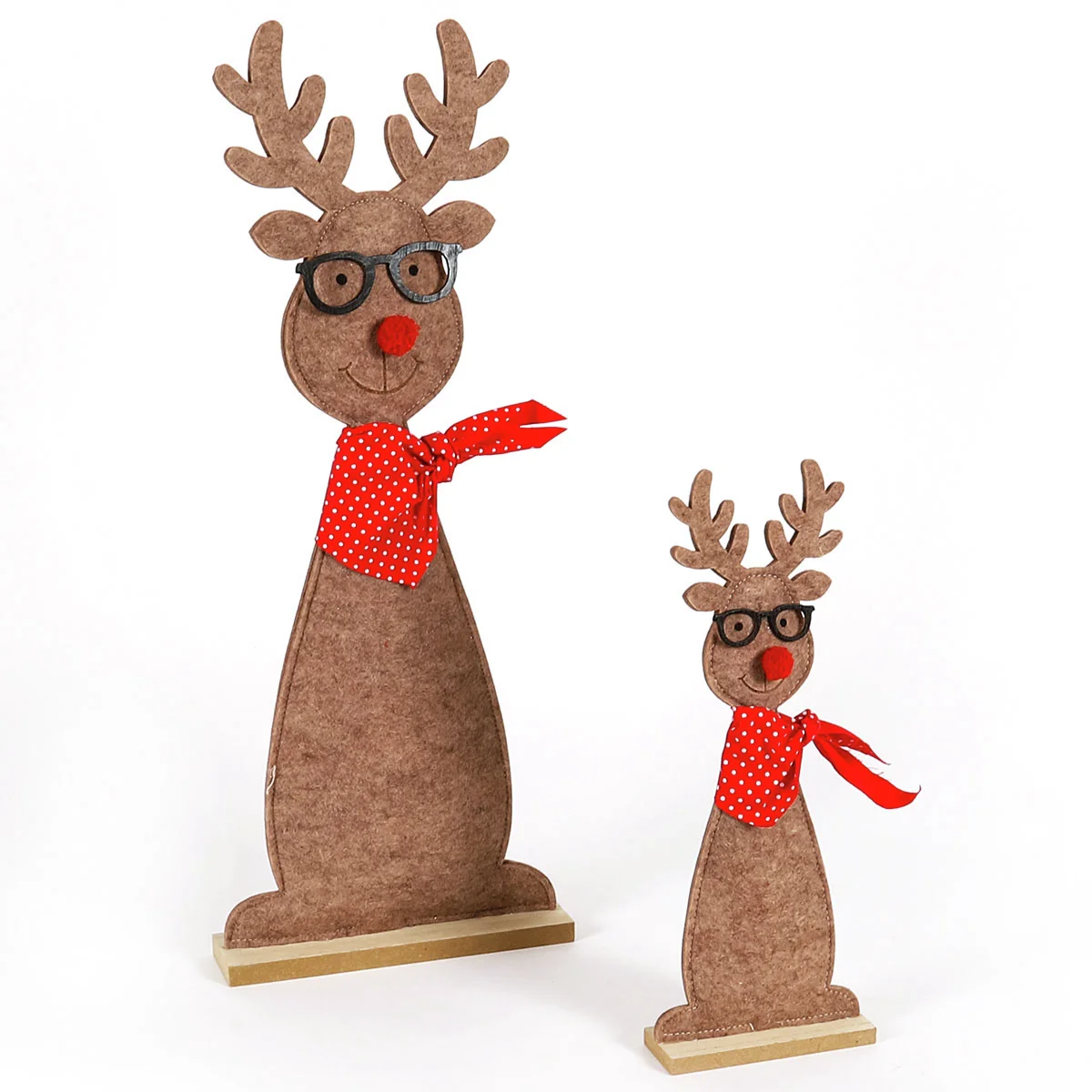 Die originelle Weihnachtsdekoration ist aus braunem Filz gearbeitet und steht auf einem stabilen Holzsockel.