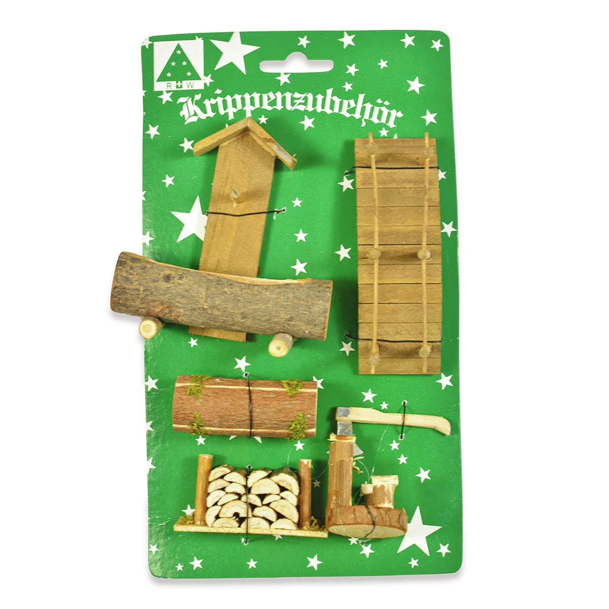 Mit natürlichem Charme und aus echtem Holz gefertigt sorgt dieses 5-teilige Set rund um Ihre Krippe für das richtige Ambiente. Mit Tränke, Holzstoß, kleinem Steg, Baumstamm und Holzblock mit Axt. Aus Holz detailgetreu hergestellt.