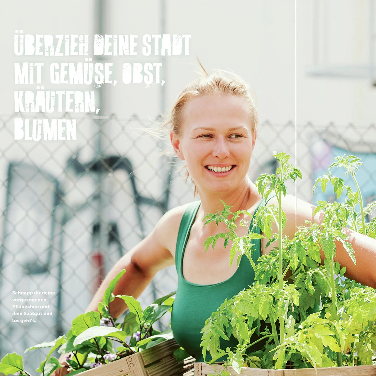 * Überzieh deine Stadt mit Gemüse, Obst, Kräutern & Pilzen: Asia-Salate vorm Fenster, Lavendelduft in der Nase, Nützlingspflanzen überall: pflanz dich durch die Stadt, brich alle grauen Flächen auf und hol dir ein Stück Ernährungssouveränität zurück.