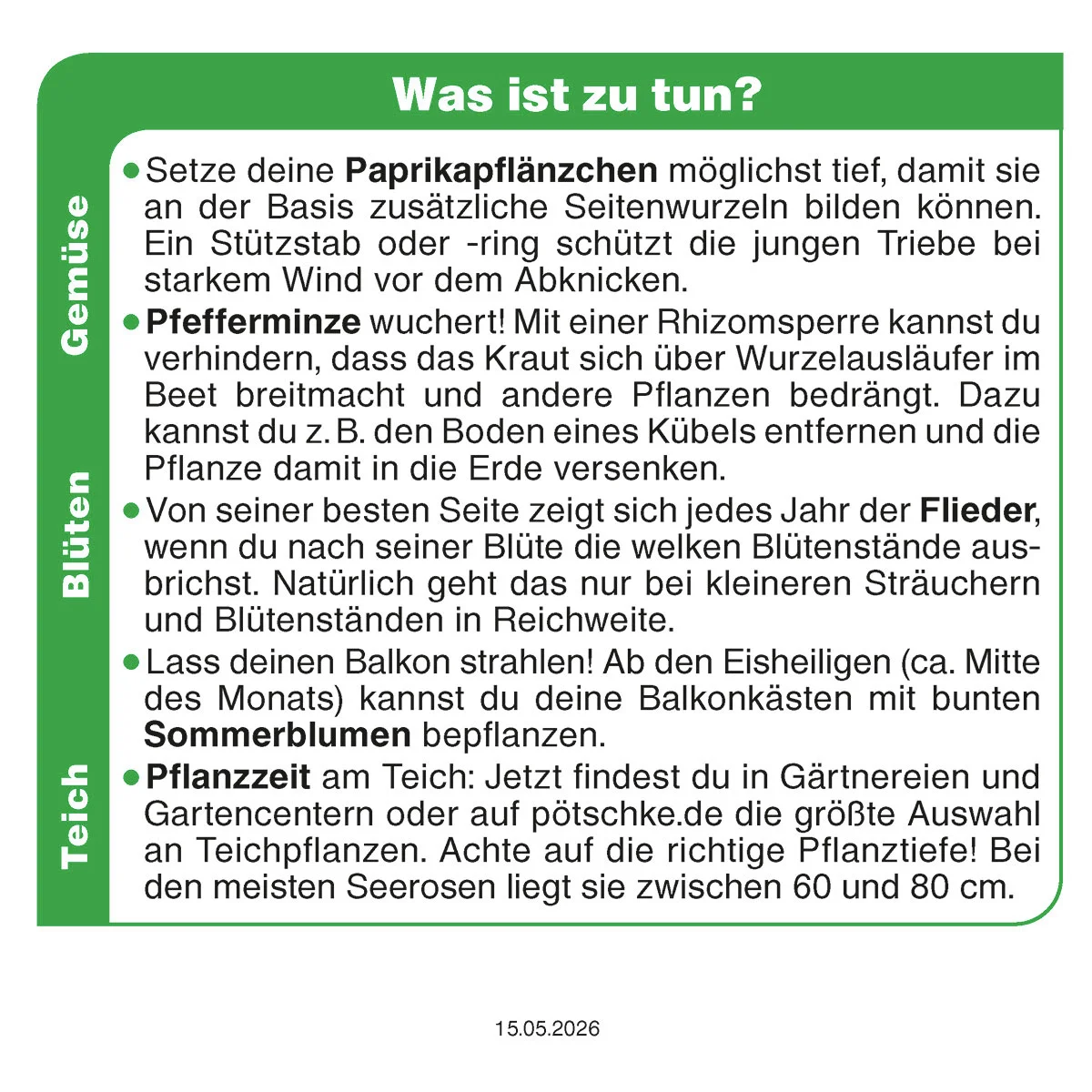 Wunderbar - Hallo,werter Herr Gärtner Pötschke, ihr großer Kalender ist eine" Wucht "!!!! Die netten Ferse und Hinweise gehören zu unserer Frühstückszeit. Auch meine Tante ist hell begeistert.Besondere Tipps oder Hinweise werden telefonisch ausdiskutiert. Ihr Kalenderblatt ist ein Grundstein für den Tag. Danke sagt Frau Keßler aus Straußfurt