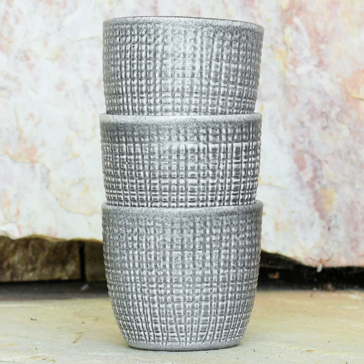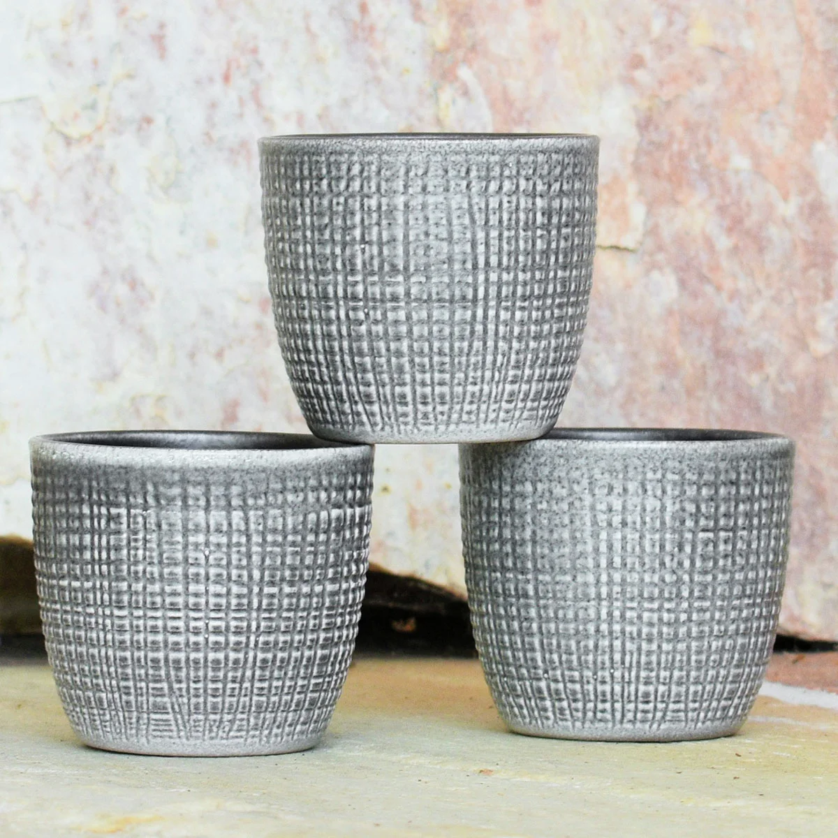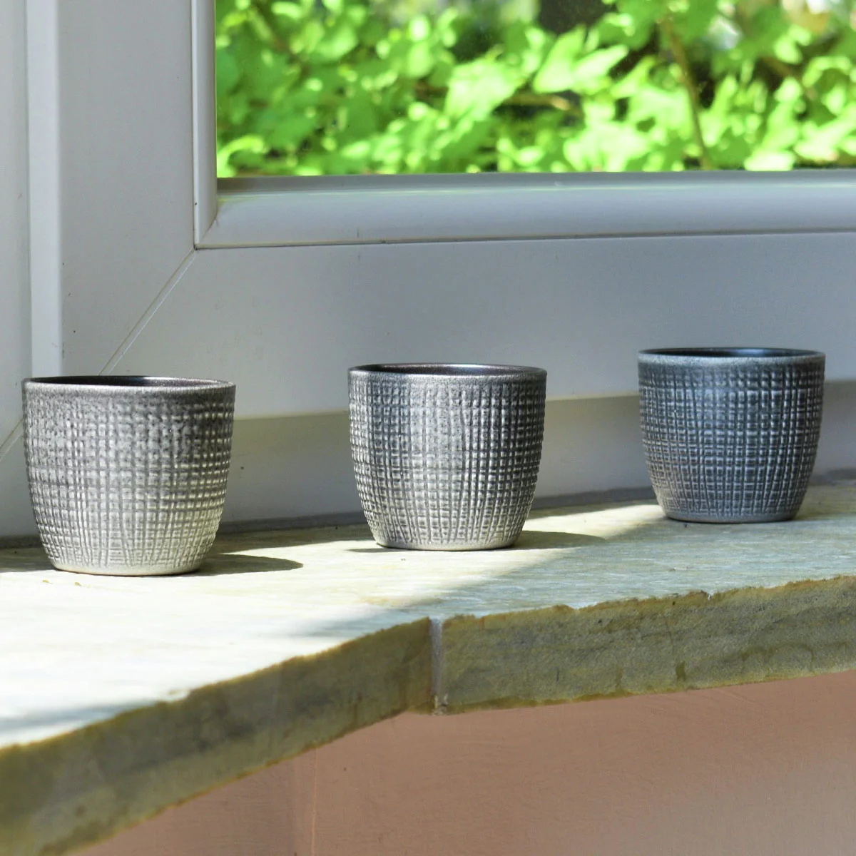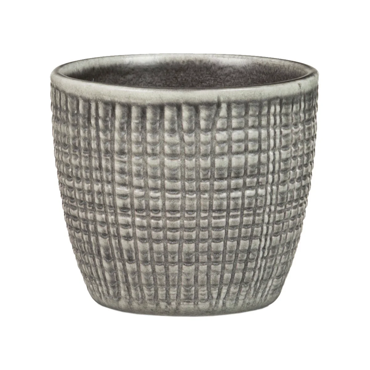 Der dickwandige Blumentopf in handwerklicher Machart passt zu vielen zarten und kleinblättrigen Zimmerpflanzen. Feine, an Textilien angelehnte Vertiefungen verleihen jedem Übertopf einen individuellen Charakter.
