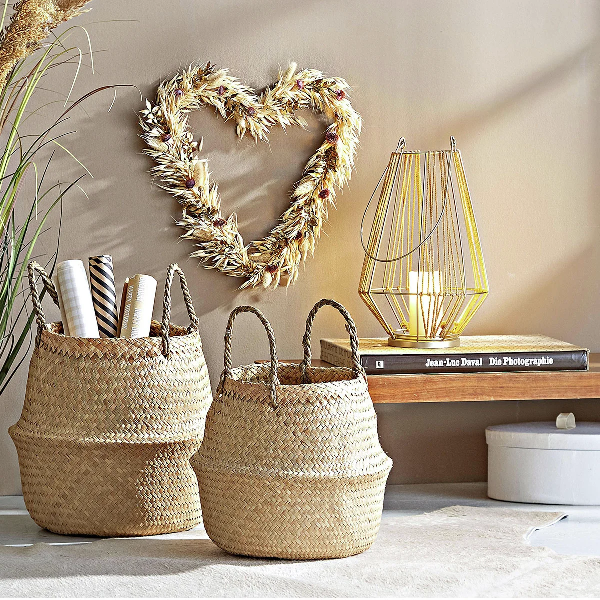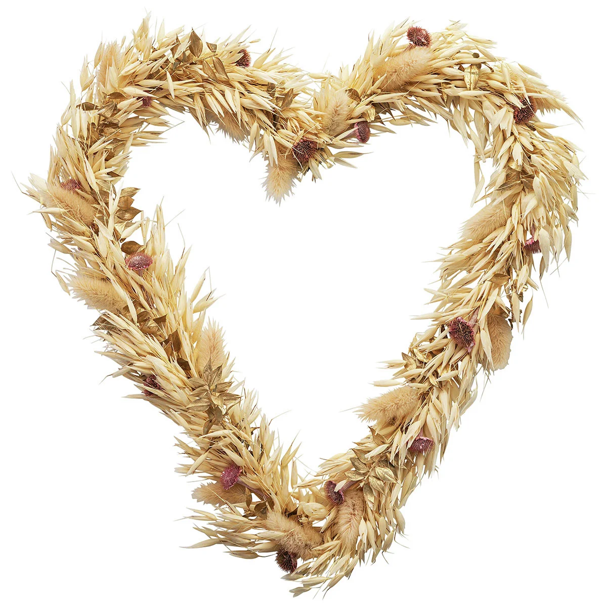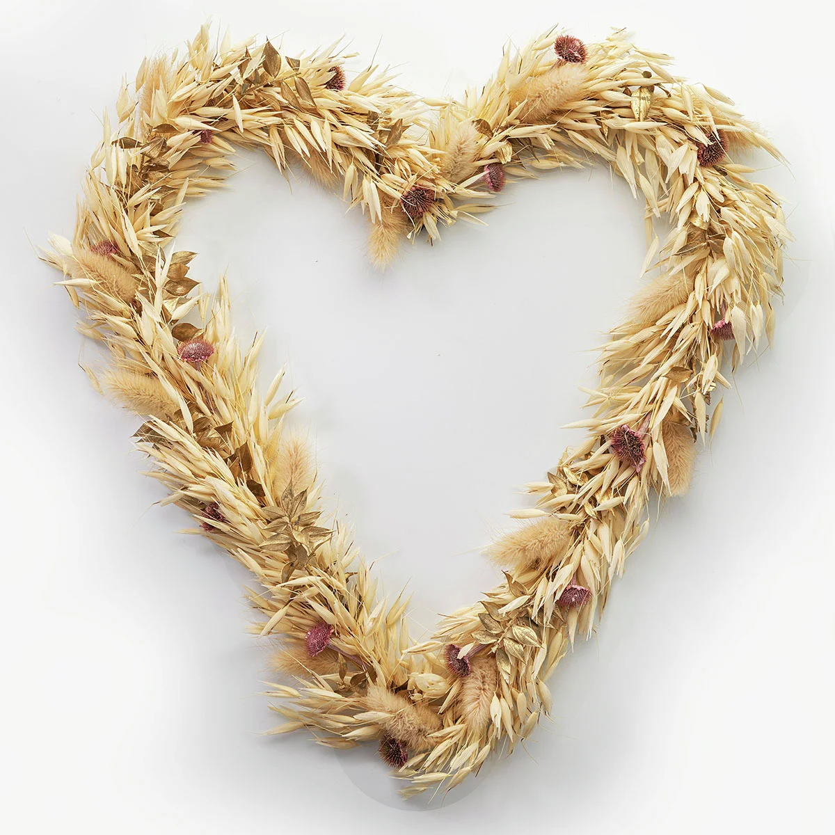 Für das Trockenblumen-Herz Boho wurde auf eine stabile Form aus Metall ein Potpourri aus Trockenblumen aufgebunden – von Hand, denn hier ist jedes Stück ein Unikat! Rustikaler Hafer, spitzblättriger Ruscus, zarte Wild Daisy und samtiges Lagurus kontrastieren in ihrer Beschaffenheit und ihrer Erscheinung. Das schenkt dem herzförmigen Kranz Lebendigkeit. Die zurückhaltende Farbgebung in Natur und zartem Rosé wird durch dezente, goldfarbene Highlights elegant ergänzt.