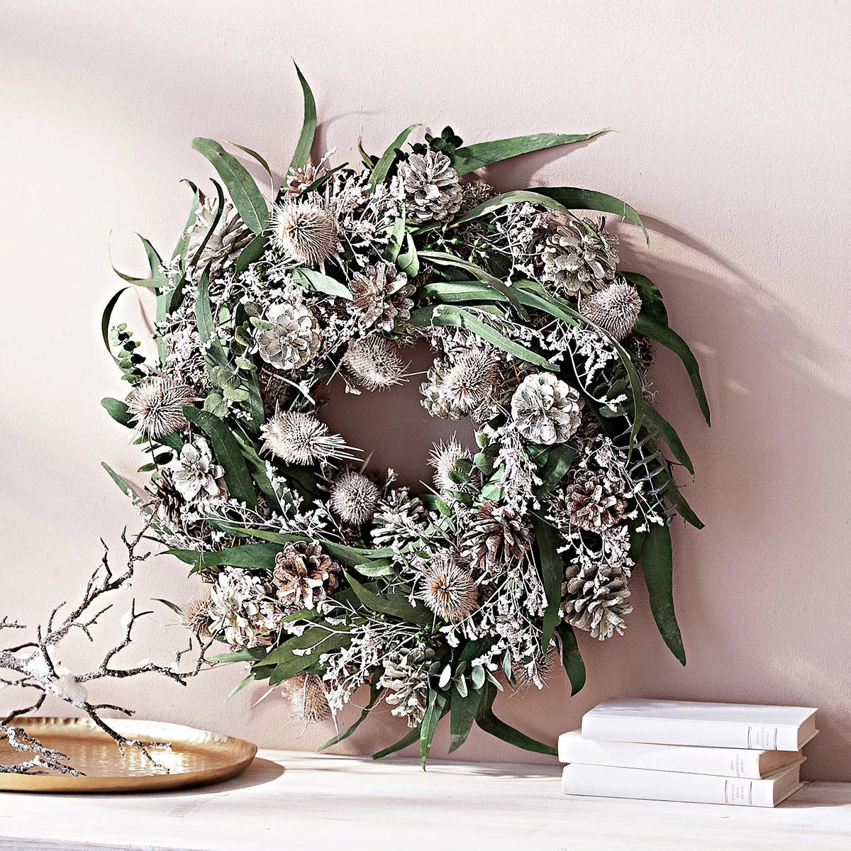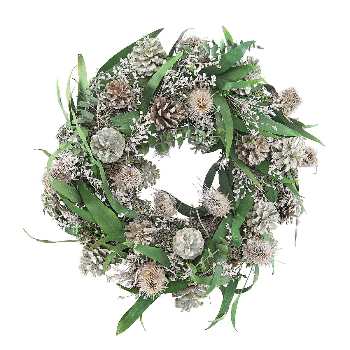 Dieser üppige Kranz besticht durch seine Größe und die exquisiten Zusammenstellung von hochwertigen Naturmaterialien. Eukalyptus Lancette, Eukalyptus Silverdollar, Kardendistel, Graumoos und Schwarzkieferzapfen bilden einen prächtigen Reigen. Mit geschmackvoll eingefärbten Farbakzenten in Grüntönen und Weiß – ein Hingucker, um den Sie Ihre Gäste beneiden werden!