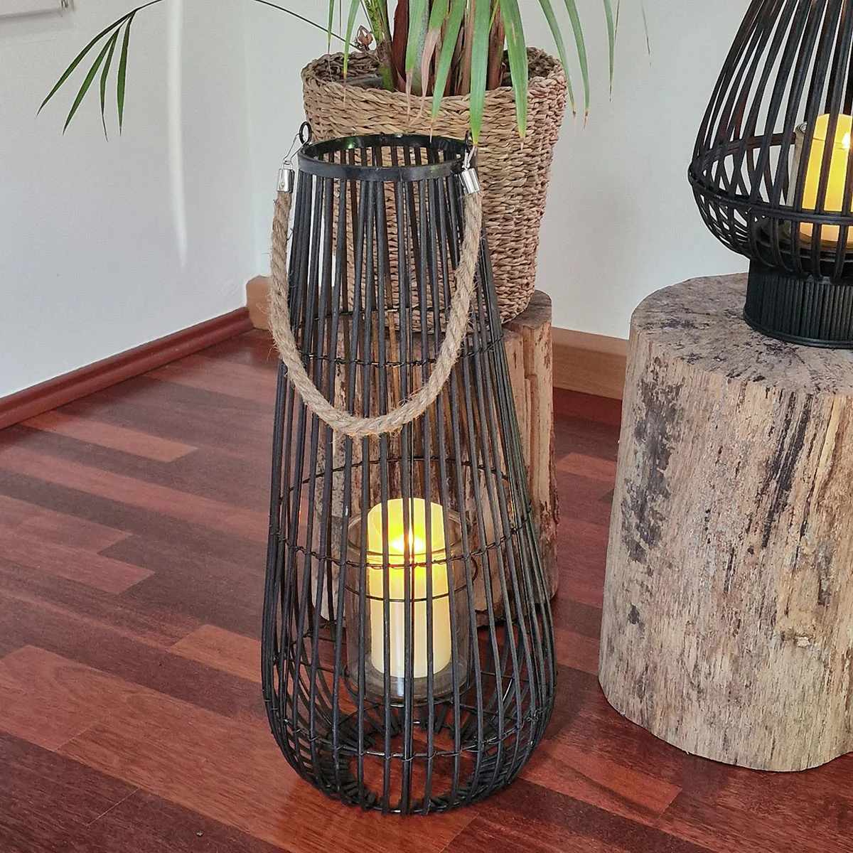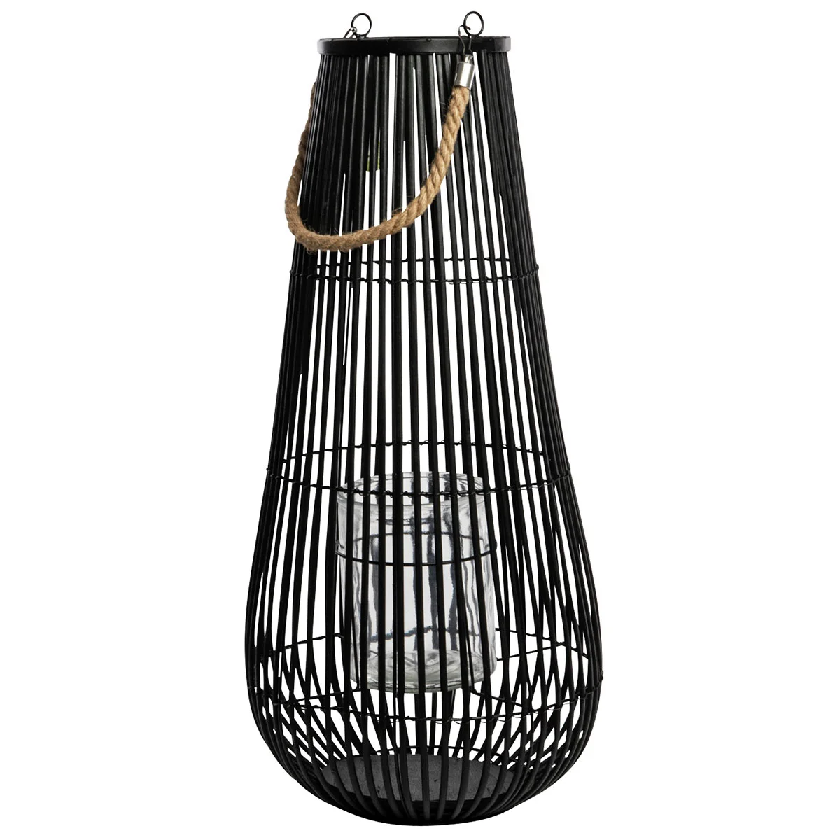 Inmitten der schwarzen Holzstreifen-Laterne scheint das Kerzenlicht bei Dunkelheit zu schweben, um drinnen wie draußen faszinierende Schatten in die Umgebung zu werfen. Und sie bietet dank ihrer konischen Form auch bei Tageslicht einen überaus eleganten, modernen Anblick.