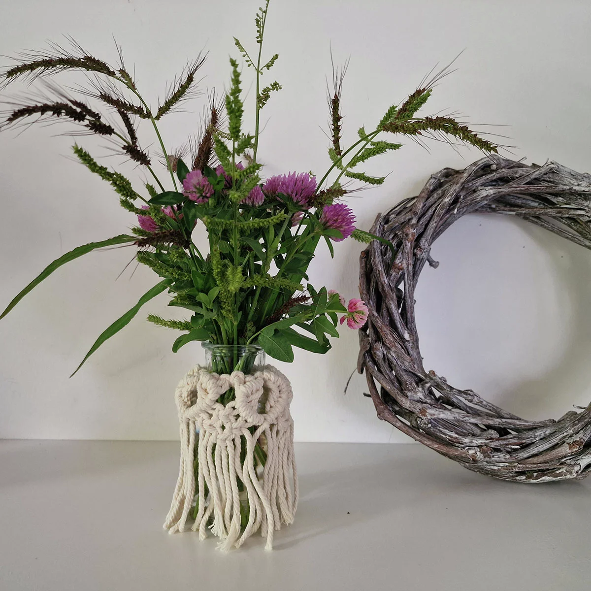 Romantisch trifft modern: Verspielte Makramee-Deko kontrastiert mit einer schlichten Glasflasche. Bestücken Sie die Flasche mit frischen oder getrockneten Blumen aus Ihrem Garten für einen hübschen Deko-Akzent im Boho-Stil.