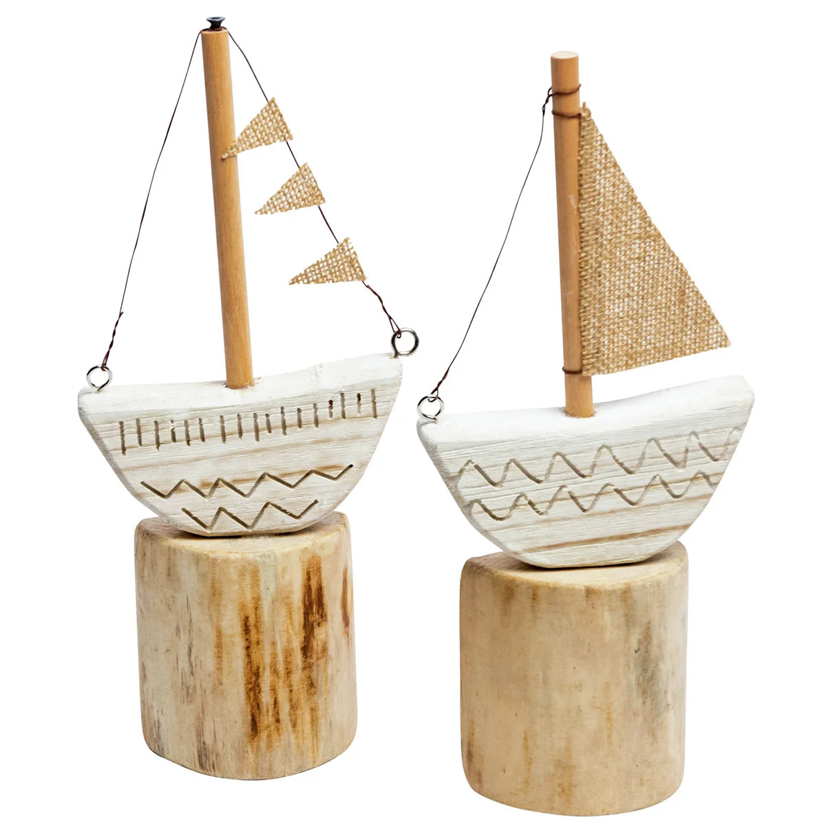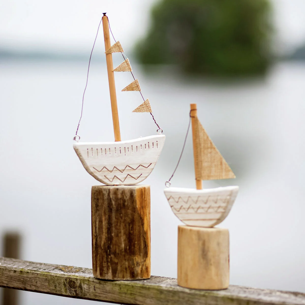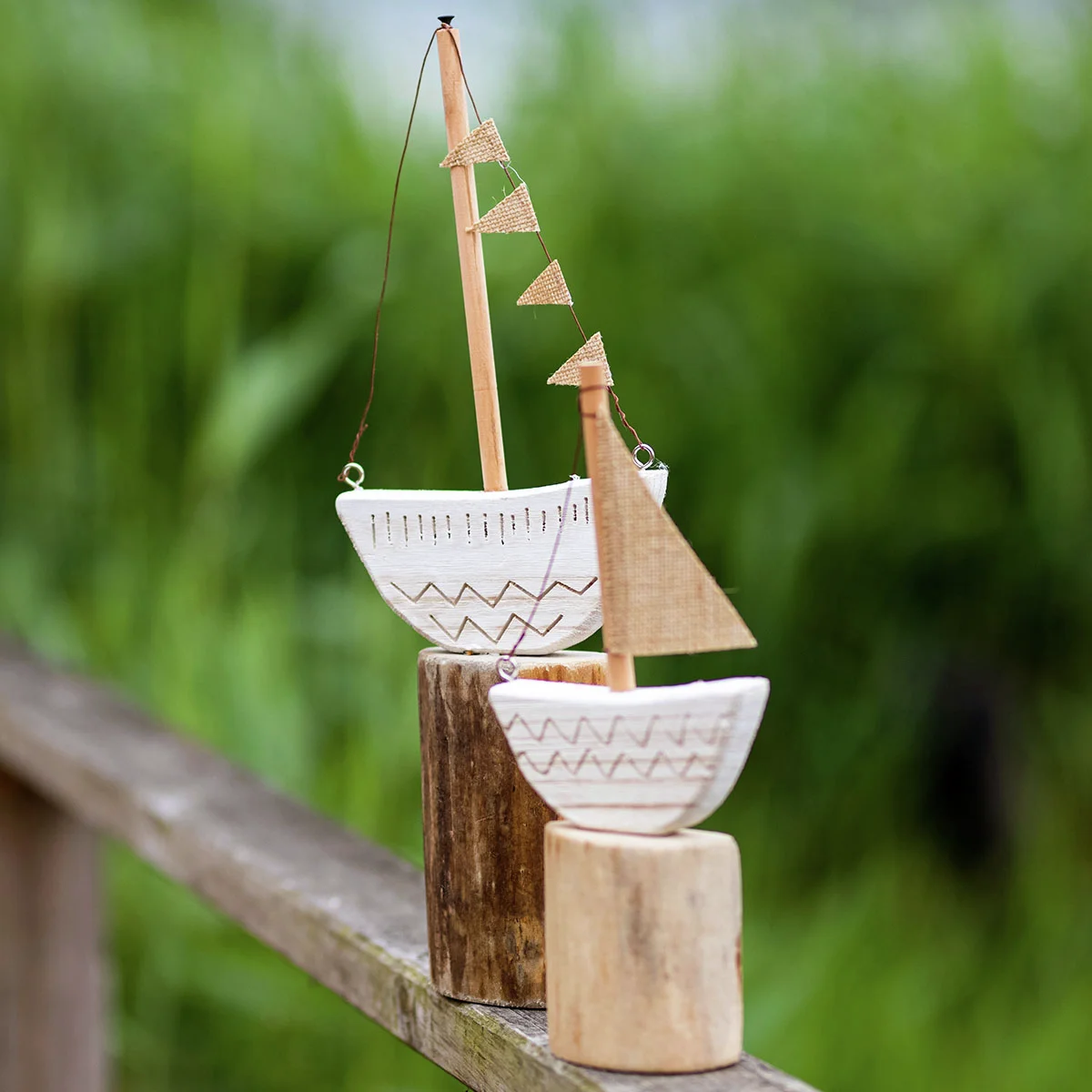 Diese beiden liebevoll gearbeiteten Boote aus echtem Triebholz machen Lust auf Meer, Abenteuer und Urlaub.