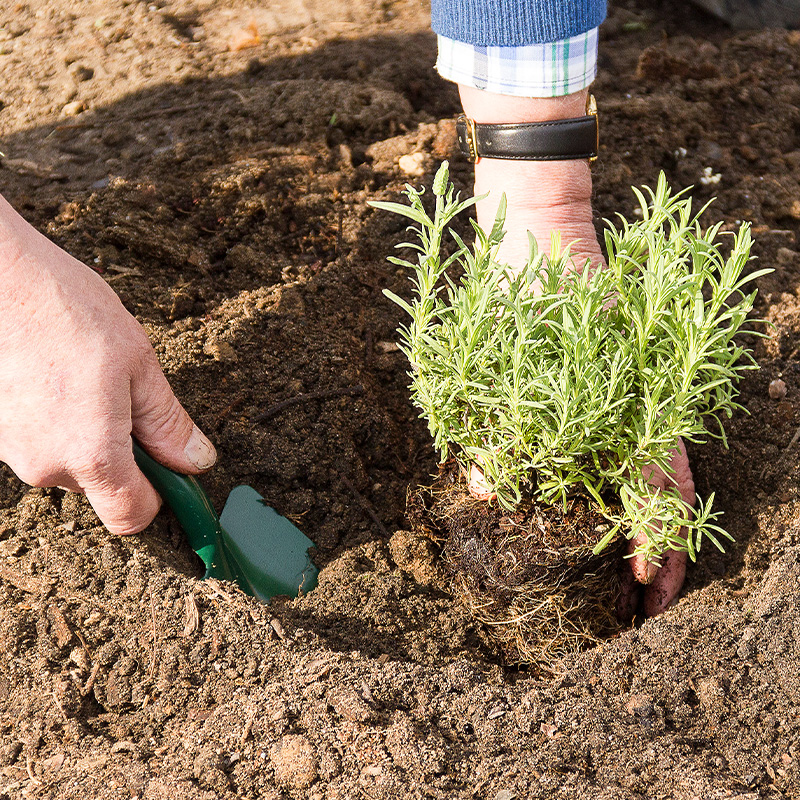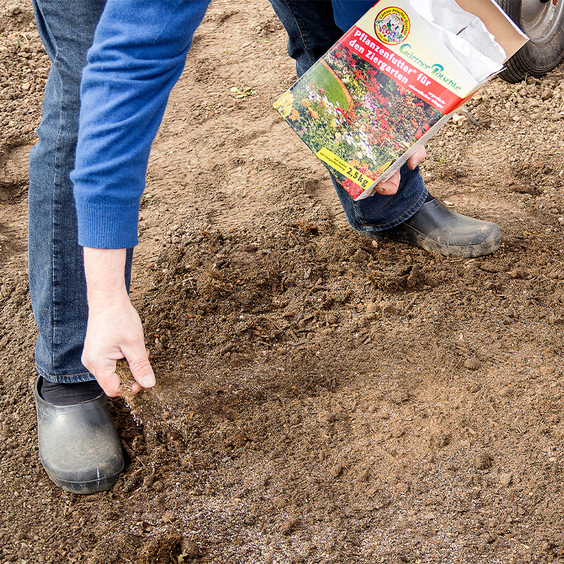 Bereite den Boden im Pflanzbeet tief umgegraben vor. Durch die Zugabe von Kompost und z.B. Gärtner Pötschkes Pflanzenfutter für den Ziergarten schaffst du ideale Bedingungen.
