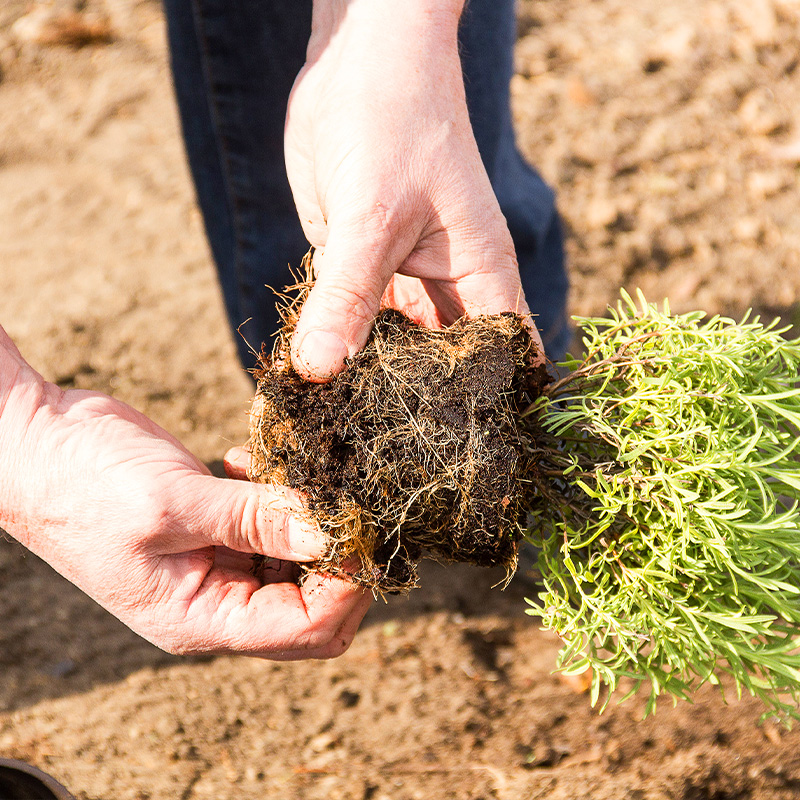 Setze den Ballen ein und fülle das Loch mit Pflanzerde. Achte darauf, dass die Pflanze nicht zu tief gerät, sie soll zum Schluss ebenerdig auf gleicher Höhe stehen wie der gewachsene Erdboden.
