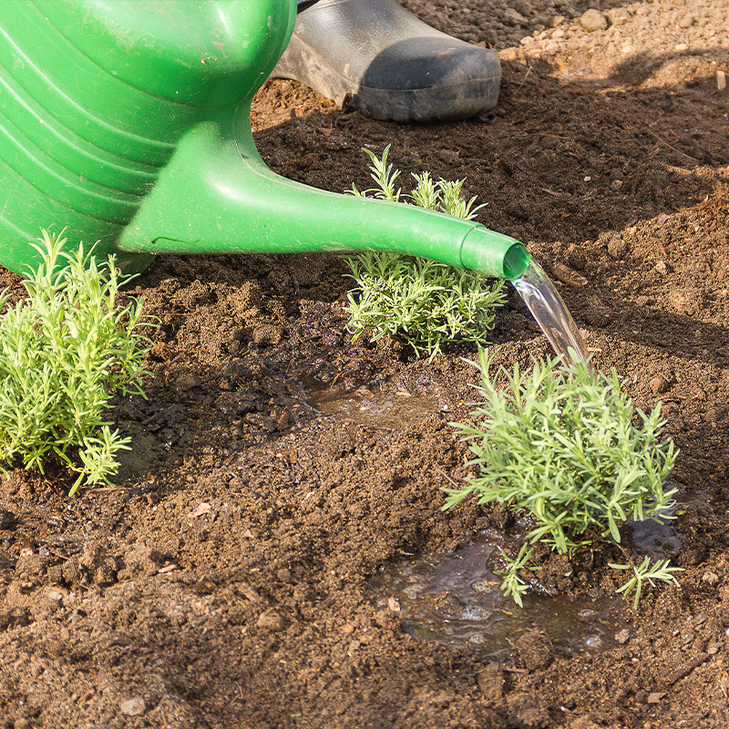 Gieße nun die Pflanzen ringsum mit weichem Strahl an. Dabei schlämmst du Erde in alle Hohlräume, sorgst für den notwendigen Bodenschluss und förderst das Anwachsen.